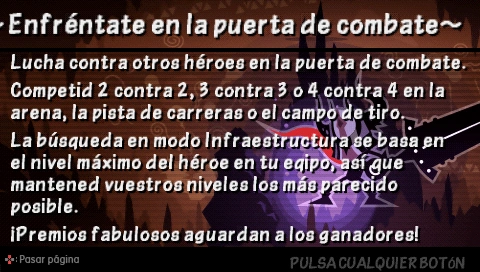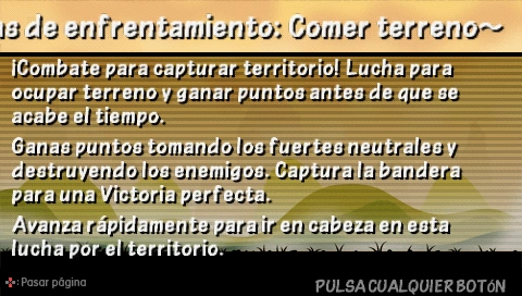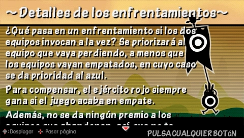 Siempre hay 2 equipos, el rojo y el azul, los jugadores pueden ganar experiencia, tesoros e invocar para ganar ventaja de los otros jugadores, no obstante, invocar mucho causa que la PSP se congele y se apague, así que recuerda ¡Invoca con moderación!♪