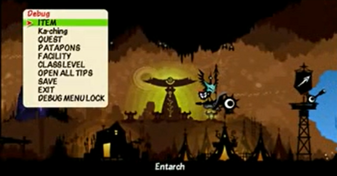In the Prologue of Patapon 2, you Can access the Debug Mode, once the Blue/Light Blue Text comes in, and forward on. -A Follow Up: If you Fail the Mission with Debug Mode, Once at Patapolis, Both the Obelisk, and the Paraget, will be unlocked. Yet, Meden doesn't seem to appear. -Another Follow Up: If you try to choose a Normal/Story Mission, you'll notice that you're not able to do so. -Final Follow Up: Same for Paraget, if you choose to Play Alone, or Bring Mysterious Eggs.