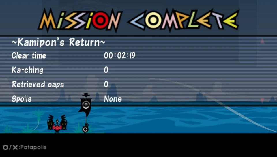 After the Prologue of Patapon 2, if you choose to have the Mission Flag at the Prologue Mission, it'll change that First Mission(The Tltle, And the Icon.). -A Follow Up: IF you choose to do the mission, once you're inside, there'll be No Music, and you Cannot use the Drums. Yet, That doesn't mean that you Can't use Debug Mode. -Another Follow Up: If you try to use the "Enable All Sound Command", it's Possible to get One Beat, before it ends up Not Working Out anymore. -Another Follow Up: You CAN use Weather. -Another Follow Up: You CAN'T use the Miracles/Jujus. -Another Follow Up: Possible to Fail it, and have (almost) nothing happen. -Final Follow Up: If you use the "Mission Goal" feature, and you open up the Debug Menu, and wait long enough, it's possible, but almost Very Rarely, that you Can see something random from forward on. Or, if you may, from the Mission Complete Screen. Possibly, this could rather be a glitch.