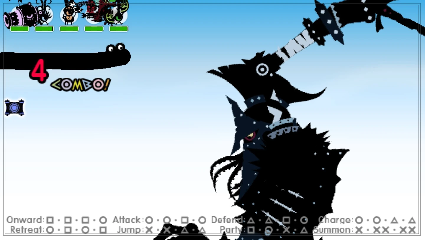 Gigantus will rise up and lift his sword high into the sky. The camera will follow him and stay fixed on his face and arm for about 4 beats, which will give you just enough time to strike one command. He will then smash his sword down onto your army. If you're far enough away, you can dodge this with PonPata, but due to the size of his sword, this is unlikely. Defend with ChakaChaka at all cost .