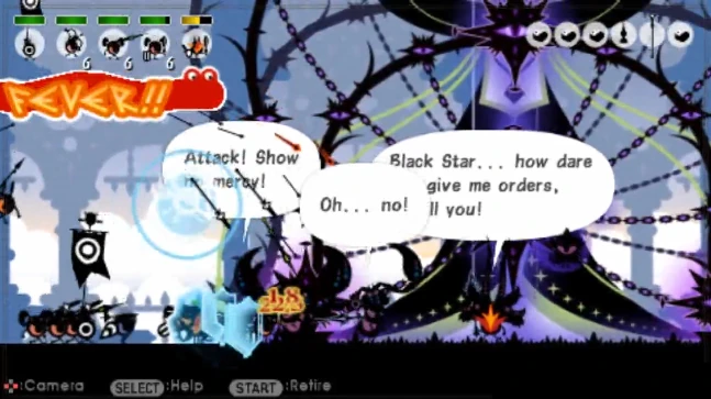 Starting off you will be attacked by Kibamen and Torimen. After they are down keep going to destroy some Karmen forts with rocks in front of them. A potion pops up. With the forts destroyed, you come across a giant contraption and two people, Dark One and Black Hoshipon. While they seem to not like each other much, they put it aside and attack you with some Akumapons. Defend against the Akuma Kibapons and Gong will show up to help. He tells you to aim for the device in the middle (only Yaripons and Yumipons will reach it). After you destroy it, Dark One and Black Star run off and Gong says they have sold their souls to a demon. Gong also says that the Great Deity needs the Patapons to destroy the demon. After you are done, you get cap for the Kururu Beruru the Bell and Shuraba Yapon minigame.