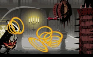 During Mucharapapa, Wondabarappa fires a burst of three large, bouncing sound waves that remain active for a considerable amount of time. The sound waves deal damage as they bounce and ricochet between enemies and terrain, quickly racking up damage and inflicting status effects. Increasing Wondabarappa's attack speed will increase the rate of the bursts.